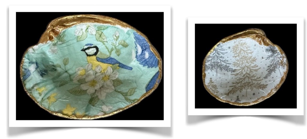 Early in the month, a class to learn the art of decoupaging shells had been signed up for; this craft of decorating objects with paper was something not done in years! The workshop, was held upstairs in an area that had no elevator. Luckily my knee was stable with a brace and I was able to attend the class: