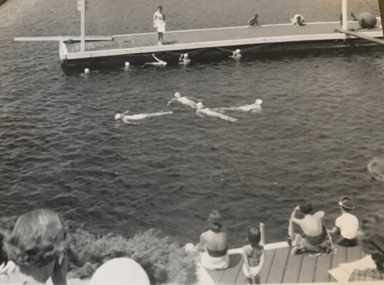 They say a picture is worth a thousand words. At our cottage on Lake Muskoka, I have a photograph that is similar to the one pictured here. However, in my other photograph, there is a larger group of young women performing in the water ballet. At first, when I looked at the photograph, I thought I was part of the group. When I looked more closely, I saw my father sitting on the rocks and I was beside him. I found my mother with her permed hair. I think I even found my younger brother with blonde hair. My future mother in law was in the photo as well. All of us were sitting half way down the rocks with our backs to the camera enjoying the production that was taking place before us. Further up on flat land , just behind the rocks, were chairs set out for the matriarchs of the club; these were for them to sit on and be comfortable.